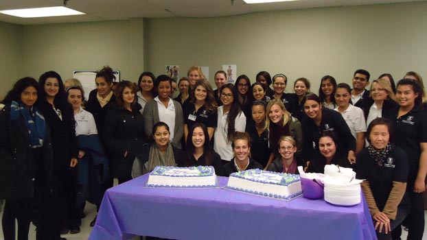 Students excitedly gather to eat pizza in celebration of their win in the 'Put Your Purple On! Photo Contest' sponsored by the Canadian Dental Hygienists Association